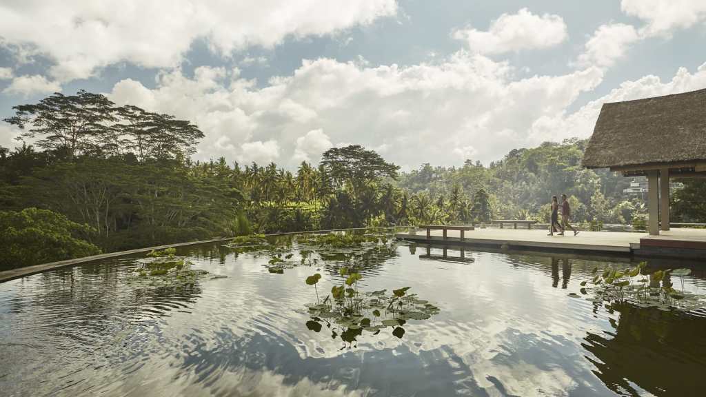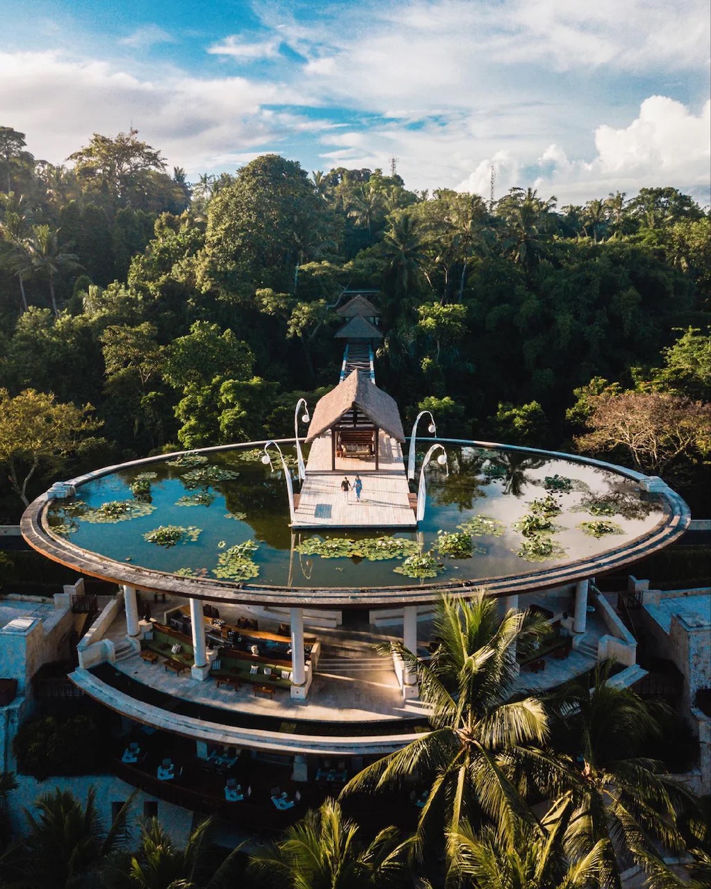 Arriving at the hotel and walking through the wooden suspension bridge that hovers above the jungle will be an unforgettable experience. As you walk through the towering gates, it feels like you step into a magical new world. A world that is filled with endless forest, croaking frogs and soothing river sounds. The bridge leads to a floating infinity-edge pond covered with lotus flowers, offering panoramic views of the untouched Balinese jungle. I’ve never seen anything quite like it—pure, unfiltered beauty everywhere around the hotel. Even if you’re not particularly spiritual, the walk across the bridge is bound to make your jaw drop.