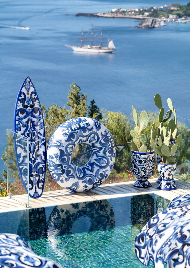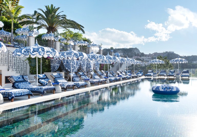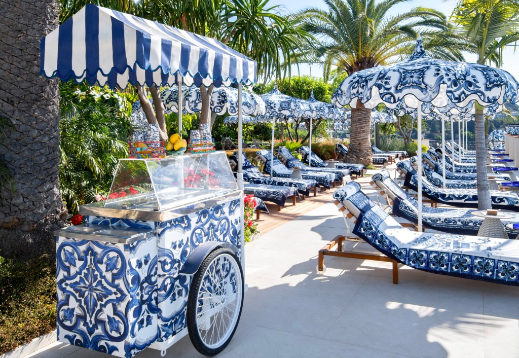 Next to San Domenico’s infinity pool, you’ll find Anciovi, a stylish option for a laid-back Mediterranean lunch. The menu features freshly caught seafood, inspirational salads, and, of course, a great selection of pasta to choose from. The typical Sicilian blue decor of the poolside restaurant seamlessly integrates with the iconic Dolce & Gabbana collaboration, which has transformed the hotel’s pool and terrace for a third summer season. Its striking Blu Mediterraneo theme elevates the pool into Taormina’s most aesthetic hangout, with its distinct motif inspired by traditional Sicilian ceramics. The Dolce & Gabbana patterns cover all sunbeds, parasols, and flowerpots, beautifully harmonising with the azure sea background. To enhance the fashion experience, guests can also visit the exclusive Dolce & Gabbana pop-up inside the hotel’s Sacristy, to browse the latest collection.