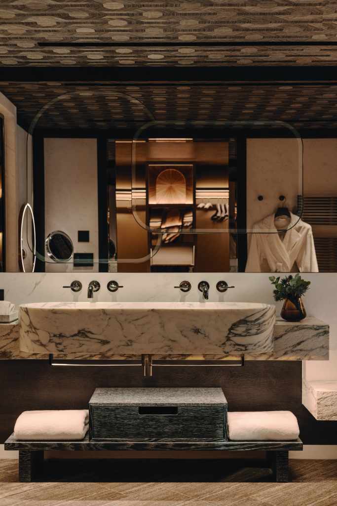 Inside, guests will find 51 rooms and suites, including three signature houses with expansive terraces overlooking Les Trois Vallées. The largest, the Jardin Alpin Apartment, comes with four bedrooms, a cinema room and generous indoor–outdoor dining spaces. All rooms feature marble bathrooms with wooden accents and a luxurious contemporary Alpine interior.